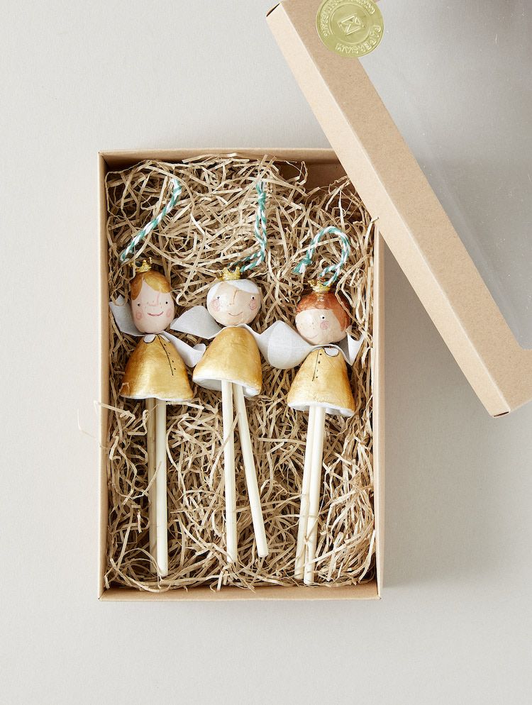 Three gorgeous little hand painted fairy’s, made of clay, wood and finished with cotton organdie wings and tiny crowns.